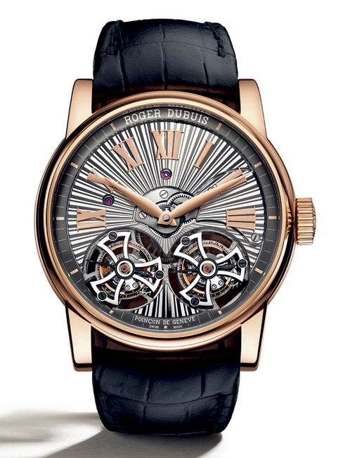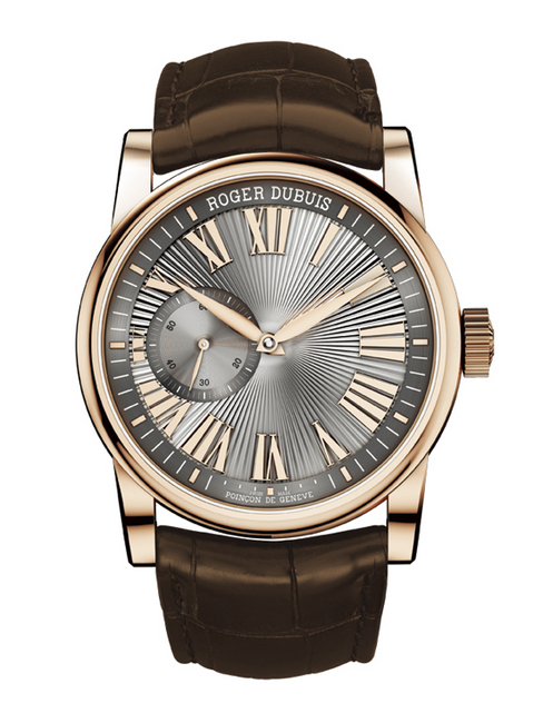產品設計部門副總監Lionel Favre先生指出,此手錶的特殊細節包括錶耳的微微傾斜、錶殼側面的緞面拉絲處理,以及為確保完美佩戴而加大的錶耳間寬度,這些細節的結合從人體工學角度提高了視覺與觸覺的舒適性。此手錶雖然具有較大的尺寸卻仍然保有細緻高雅的造型,維持著古典血統,煥發出迷人的氣質。抛光與緞面拉絲交替的表面處理伴隨著已然成爲ROGER DUBUIS羅杰杜彼品牌特徵的陽光飾紋,再加上如鍍銠機芯與玫瑰金錶殼之間所產生的對比作用,一起塑造出魅力非凡的構圖效果。