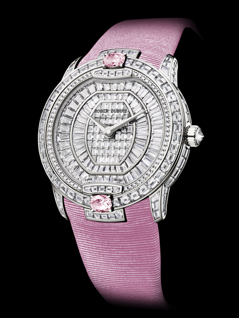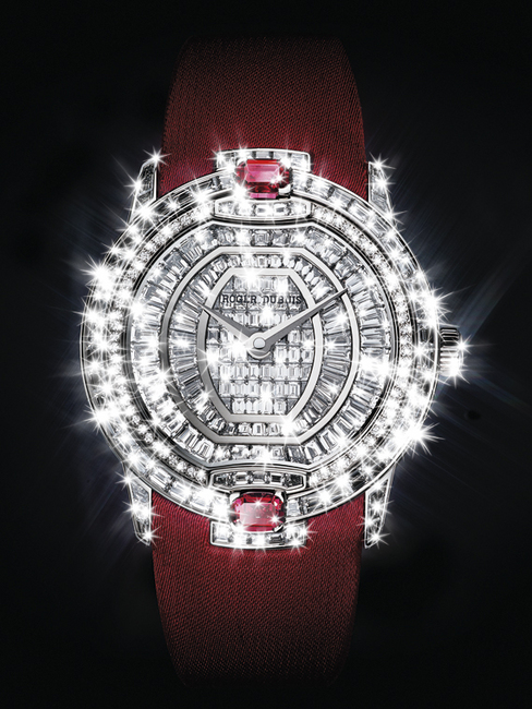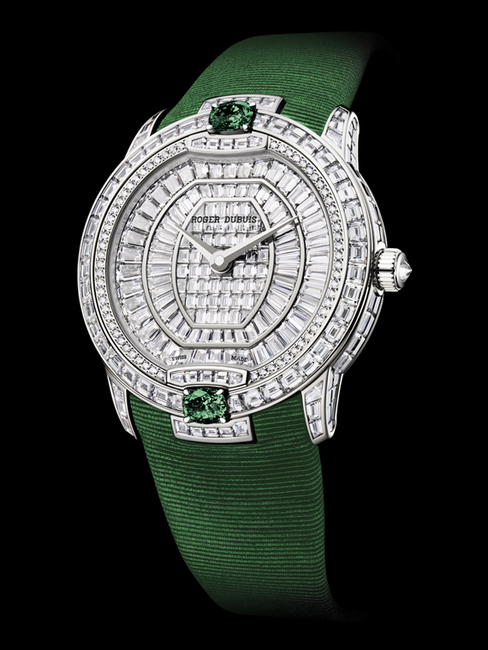 今年ROGER DUBUIS羅杰杜彼以直徑36毫米、鑲嵌長角階梯切割鑽石的白金高級珠寶手錶為基礎,提供了一系列錶款,將名伶女性魅力帶給每一位鍾情手錶的女人。這些超卓時計全面鋪鑲367顆、總計約11.26克拉的美鑽:長方形切割鑽石鑲嵌於錶盤、錶環、錶耳、錶扣和裝飾位置上,明亮式切割鑽石則鑲嵌於錶盤外環圈。兩顆貴寶石(每顆大約0.50克拉)的裝飾使這些手錶更具有鮮明特色。客戶們可以依照其個性與品味選擇她們喜愛的貴寶石,例如深濃的紅寶石,強烈的藍色、粉紅色或黃色藍寶石,神秘的祖母綠。ROGER DUBUIS羅杰杜彼的寶石專家以非常嚴格的切割、淨度、成色和產地等標準細心精選每顆寶石,使得每一枚時計更爲超凡出衆、一枝獨秀。