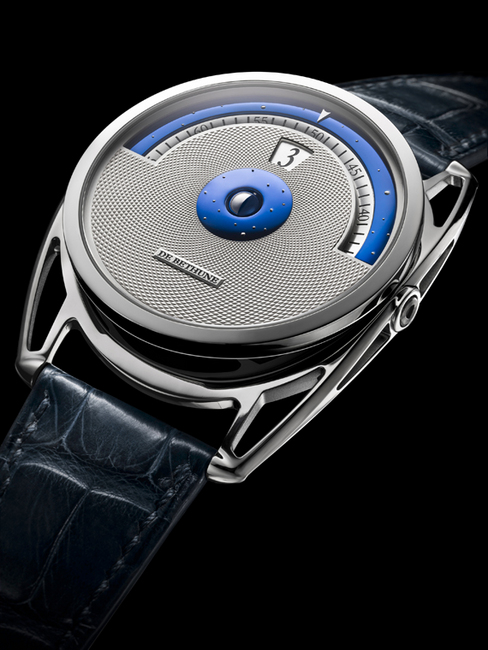 銀色的機刻雕花圖紋,是所有靈感與美的來源。面盤中央經過雙重處理─一邊以鈀金製成、另一半則以藍鋼製成─的立體球形月相,帶來了和諧平靜的美感。精準的月相顯示,運行1112年才僅有一天的誤差。面盤的外側從三點鐘到九點鐘方向,是以飾有微型鋼質珠粒的蔚藍天空,由機械動力帶來能源的系統,用以指示分鐘,並提供了數字顯示小時視窗同樣的動力。