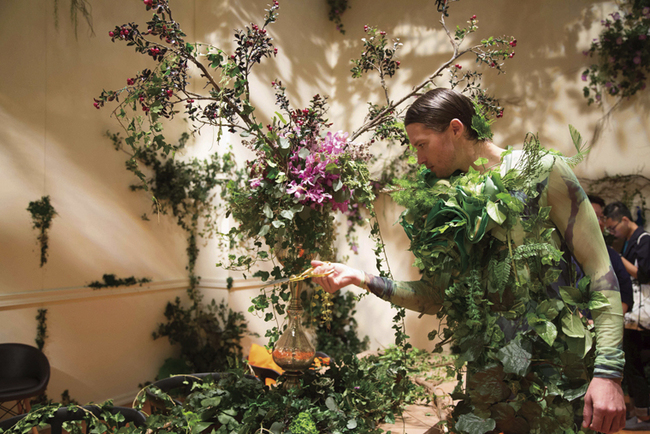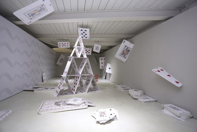 看王家衛電影的時候,常常會有定格或是慢動作的畫面出現,當時間脫軌的那一瞬,往往美的深刻而難以忘懷,然而在現實世界裡,時間仍然按照物理規則每分每秒的消逝,可是愛馬仕本次所舉辦的"Time to dream II"活動,要讓你體會的不是分秒必爭的緊湊,而是那停格後的美妙,就像時間暫停手錶的概念一樣,愛馬仕要所有參與這場盛會的觀者自行按下心中那停止時間的按把,讓每個人體驗時間靜止後的片刻,因此每一位旅人在入場前必須以緞帶遮蓋住所有可以顯示時間的儀器,在戴著動物頭套的時間守護者引領下,旅人步入遺忘時間的空間,滴嗒滴嗒⋯⋯那被拋下的時間留在入口之外,首先踏入的是第一個房間,藤蔓、枝枒以及散落一地的樹葉,這滿佈的凌亂與昂然綠意是「曾經活著的空間」,裡頭更有一名男子被樹枝纏繞一身,停頓在當下,在這個空間裡時間緩慢而長,有如靜止,或許一年、或許十年,樹幹才會長成可以看見時間痕跡的模樣,離開這裡,踏入第二個房間;這裡是「建築卡片堡壘」,宛如孩童的一場惡作劇,輕身、紊亂、不穩定的撲克牌結構象徵了時間秩序的崩毀,一地的撲克牌唯有旅人再次拼湊組合,才能重新掌握時間能達下一個目的地。