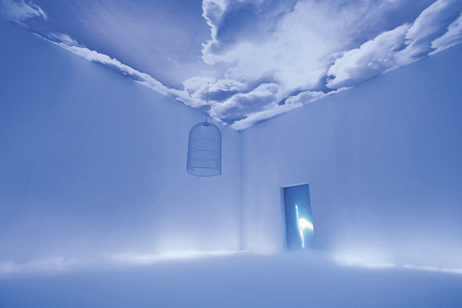 接著來到了第三個房間,放眼望去整片空間被藍色佔據,蔓延在地面上的雲朵讓旅人感到如夢似幻,彷彿置身於天空踩踏真實的白色雲朵,然而掛在天花板上的籠中關著的不是鳥,而是一片柔軟的雲,在這裡愛馬仕要說的不是時間,而是人們對待時間的方式,在逐日奔波紛忙的日常裡,被關起來的白雲如同被綁縛的自由,曾幾何時我們遺忘了時間真正的意義並非限制,而是充滿無限可能的想像,柔軟的就像雲朵千變萬化,時間的主控權其實藏在旅人的手裡,一旦參破這層意義,時間有沒有停頓都不重要了,籠中的雲朵可以穿透一切限制,自由自在的在空中漫天舒展。