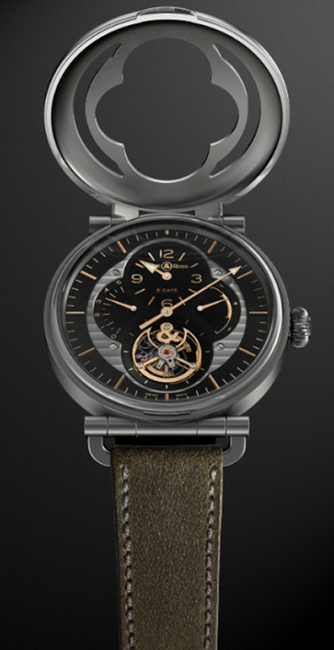 Vintage系列全新WW2 Military陀飛輪手錶擁有四項複雜功能,鈦金屬錶殼直徑45毫米,外加保護罩,是BELL & ROSS向當時那一頁鐘錶歷史致敬之作。
