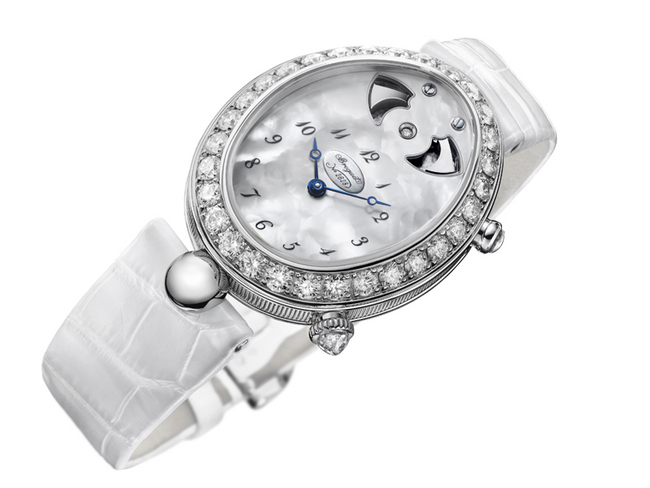 Reine de Naples系列表達了對世界首枚手錶的敬意——這枚手錶是那不勒斯皇后卡洛琳•繆拉(Caroline Murat, Queen of Naples)於1810年向阿伯拉罕-路易•寶璣訂製的,1812年完成交付。Reine de Naples 8978 是寶璣推出此系列的第一款複雜功能錶款:自鳴錶。此精心製作的複雜功能錶會自動在每個整點發出兩道鈴聲,並且重複三次,以迷人而明確的方式提醒時間的流逝,佩戴者也可以由2點鐘方向的按鈕來關閉這項功能。自鳴錶採用寶璣工作坊特別為女士手錶所研發製作的全新蛋形機芯,結合精密響鈴裝置及細緻的設計美學,並且全部以手工精心鐫刻裝飾。在技術性考量上,製錶師應用寶璣技術專家對於自鳴及三問功能手錶的研究成果,並展現更進一步的藝術美學的企圖心。全新機芯的支架及自動錘的形狀與細節裝飾,共同構成和平之鴿翱翔的畫面,可透過透明藍寶石底蓋一覽無遺。白金錶殼襯托出白色珍珠母貝錶盤,鑽石鑲嵌繞著外圍錶框,一顆鑽石標誌響鈴的開端,錶盤上方11點鐘至1點鐘位置,響鈴音錘清晰可視。Reine de Naples 自鳴錶是真正的高級鐘錶傑作,其完美設計體現了海耶克對於寶璣的評價:「寶璣正是美學及先進技術的完美融合。」