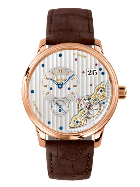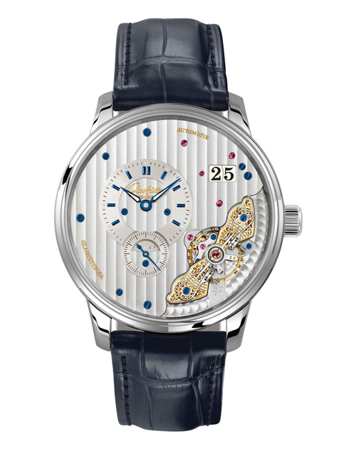透過錶底的藍寶石水晶可一窺機芯,其中精緻的鏤空中央自動擺陀配備21K金邊,自動陀軌道與經典的裝飾紋相得益彰。不對稱的錶盤設計為雙鵝頸微調裝置提供充裕的空間,與格拉蘇蒂原創偏心系列的特色錶盤設計相映成趣。