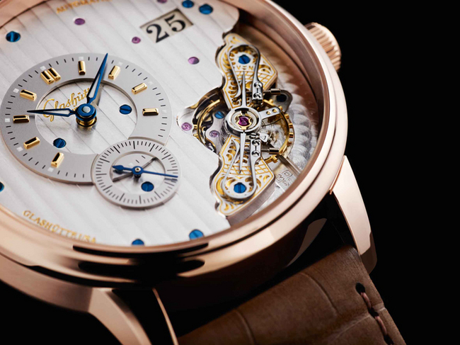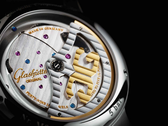 全新的格拉蘇蒂原創機芯倒置大日曆手錶PanoMaticlnverse展現了機械機芯的魅力,呈現於錶盤上的雙鵝頸微調裝置使格拉蘇蒂原創的設計工藝大放異彩。
