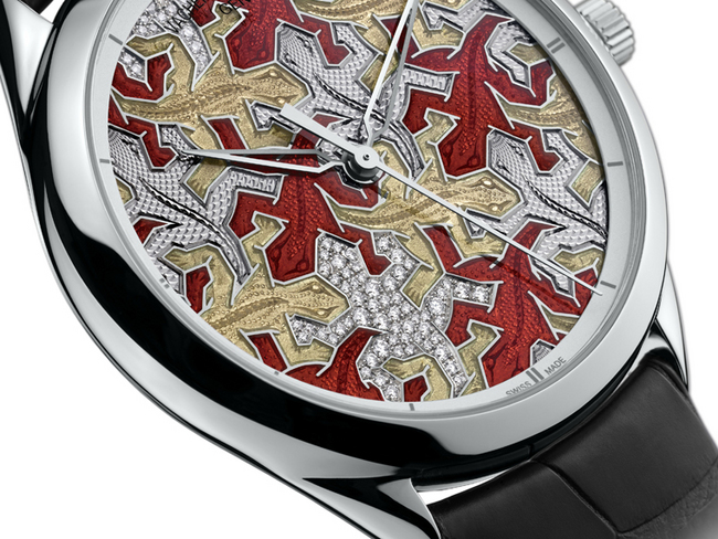 錶盤上的紅色和棕色蜥蜴或以寶石鑲嵌,或閃泛著淡淡銀光,皆展現著其栩栩如生、優美迷人的動態。手錶從這位荷蘭畫家的版畫《蜥蜴》中獲得靈感,糅合四種古老的裝飾工藝,把畫面塑造得惟肖惟妙。
