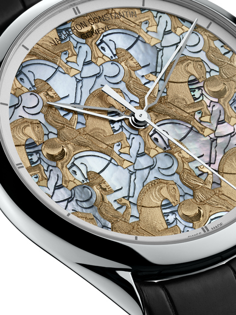 精細鑲嵌工藝大師利用兩種渾然不同的材料創作出一道極其複雜的圖案。他們先用黃金和珍珠母貝雕琢出每個騎士的面貌,猶如在玩拼圖般在黃金底盤上將它們仔細拼接出來。每件圖案之間沒有明顯的縫隙,要在方寸間實現這種極細緻的工序絕非易事。處理珍珠母貝時亦需特別細心,因為珍珠母貝不僅極其易碎,其厚度、色彩及明暗度也必須搭配得宜,而且由於要與黃金拼片緊密貼合,其曲線與直線連接位置必須保持高度流線。最後一道工序則交到雕刻大師手上,以雕鏤工藝刻劃出騎士和馬匹身上的細節線條。