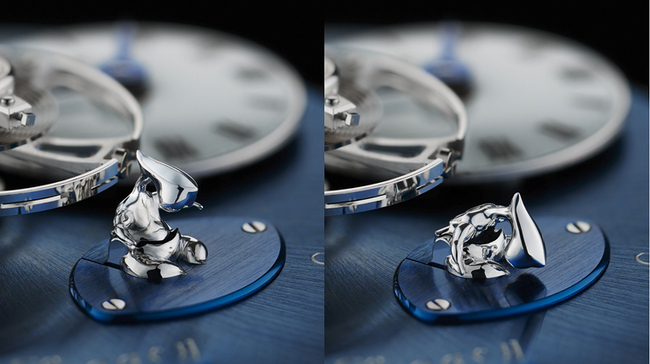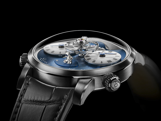 除了立體配置浮在面盤上的擺輪之外,它兩側的白色面盤上,可以看到明亮的藍色指針同樣飄浮著。有微微弧度的面盤上,塗佈著透明的清漆,閃爍著光芒,這是以名為「烤漆(laquetendue)」的工法所創造出的特殊效果,這個工法在塗上數層漆之後再加溫,讓漆面能夠均勻平滑地披覆在面盤上。