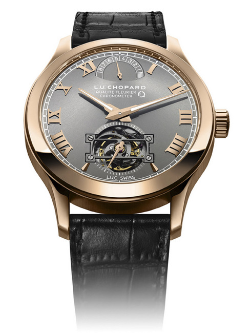新款 L.U.C Tourbillon Qualité Fleurier Fairmined手錶配備優雅的43毫米直徑錶殼,以獲「公平採礦」認證的玫瑰金打造而成,表面經緞光和拋光交替處理。灰色錶盤搭配精雅獨特的細節,令時間顯示一目了然。微妙的太陽紋圖案自動力儲備指示窗中央散射而出,似乎欲捕捉光線的軌跡。太子妃式鍍金指針的造型靈感源自30年代風格,與錶盤形成鮮明對比。時標採用精緻的立體鑲貼造型,鍍金羅馬數字則環繞著鐵軌式分鐘刻度圈。透過藍寶石水晶錶底蓋,可欣賞搭載陀飛輪和動力儲備指示器的L.U.C 02.01-L機芯的運行型態。動力儲備顯示位於午時位置,指示剩餘的動力儲能,此錶款擁有長達216小時,即九天的動力儲備。此系列手錶防水深度為50米,限量發行25枚,搭配經CITIES(瀕危野生動植物國際貿易公約)認證的手工縫製鱷魚皮錶帶。啞光黑色明面,棕色小型鱗紋襯裡,配有針扣。與錶殼一樣,錶扣亦以獲「公平採礦」認證的18K玫瑰金製成。