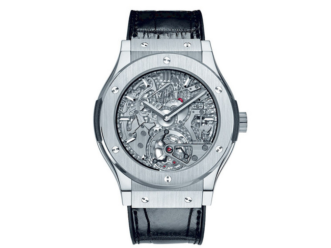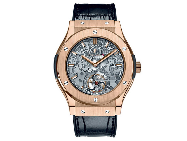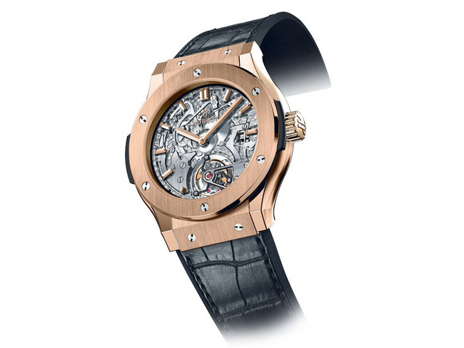 透過藍寶石鏡面,HUB8001手動上鏈機械機芯的陀飛輪擒縱裝置和三問裝置清晰可見。最值得注意的是新設計的時間設定功能以及經典陀飛輪裝置(擁有13.6mm直徑框架、每分鐘旋轉一周)。此外,機芯錶盤一側橋板設計確保了陀飛輪運作的結構穩定。夾板、棘凸輪和彈簧、齒條和音錘、音簧和蝸形輪、框架、齒輪、寶石軸承、螺釘——手錶多達319個零件的精密組裝即是裝飾元素,構成獨特的美感,輔之以玫瑰金或鍍銠的指針搭配不同錶殼材質,更顯得精美絕倫。