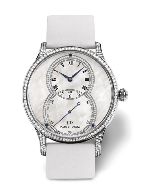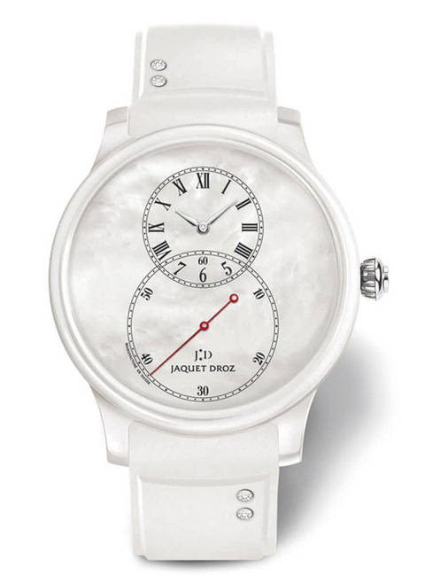 JAQUET DROZ陶瓷珍珠母貝大秒針手錶再次顯示出品牌在製作工藝上不斷超越自我的能力。潔白無瑕的質朴外表後面凝聚著鬼斧神工的精湛工藝與創新精神的精華。陶瓷珍珠母貝大秒針手錶採用了JAQUET DROZ的經典圖案:數字8。而錶殼選用無比精美的陶瓷材質,更具現代感。橡膠材質的純白錶帶鑲嵌4顆鑽石,隨著光線變化流轉璀璨色彩。白色珍珠貝母錶盤散發彩虹光芒,為佩戴者奉上歷經洗練的優雅之韻。無疑是母親節佳禮的絕妙之選。