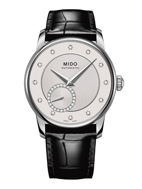 同心圓的方式浮凸演繹面盤兩種層次的立體感,光影變幻折射出放射亮澤,增添錶款的美感層次。銀白色錶圈、錶耳、錶冠搭配錶徑35mm,呈現出內外細膩優雅折射光澤,透明鏤空底蓋可欣賞日內瓦波紋及MIDO鐫刻標誌。小秒盤首度設計座落於七點鐘方向,小秒盤更以鑽石鑲嵌環繞,宛若歌劇女伶以小碎步自轉展現的嬌媚曲線。雙面防眩藍寶石水晶玻璃鏡面處理,讓配戴者方便於雙角度的時間閱讀。錶帶則搭配高質感黑色鱷魚皮壓紋,簡單、優雅的曲線,讓女性戴上輕盈展現優雅!