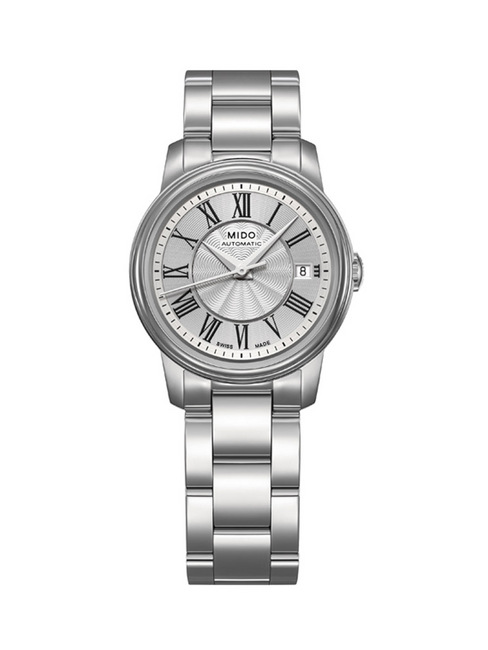 取自米蘭艾曼紐二式迴廊簡單的建築線條,Baroncelli推出的女仕迷你鍊錶,純銀潔淨的一體成形曲線,精緻細膩的唯美設計,搭配面盤上波光粼粼的機鏤雕刻圖樣,宛若折射的星芒散發女性自信魅力。銀白色錶圈搭配超小錶徑25mm,呈現出內外細膩優雅折射光澤;羅馬數字時標搭配3點鐘位置的小巧日期,簡約設計更彰顯錶盤輪廓;透明鏤空底蓋可欣賞日內瓦波紋及MIDO鐫刻標誌。雙面防眩藍寶石水晶玻璃鏡面處理,讓配戴者方便於雙角度的時間閱讀。採不銹鋼窄版鍊帶設計,適合女性做為穿搭的首飾,為整體舉手投足更添亮眼光彩,展現女性的纖細手腕的柔美優雅。
