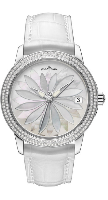 花似自然界中的翩翩仙子,在清風中撒下清雅香氛。在探尋新的靈感時,令人驚奇的花朵的完美和變化多樣激發著BLANCPAIN寶珀的想像,並順理成章地成為致敬女性的主題。此款蓮花系列手錶取高雅之蓮花造型,採用大膽和前衛的線條設計,珍珠母貝面盤自然而華麗,其變幻莫測的光澤和紋理恰好對應蓮花花瓣的觀感,在BLANCPAIN寶珀工藝大師的手下完美合而為一。此外,兩行精巧鑲嵌的鑽石使經典的雙層錶圈更顯生機盎然。此款手錶機芯採用自製Calibre 1150自動上鍊機芯,其動力儲存達100小時。
