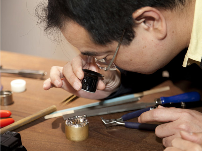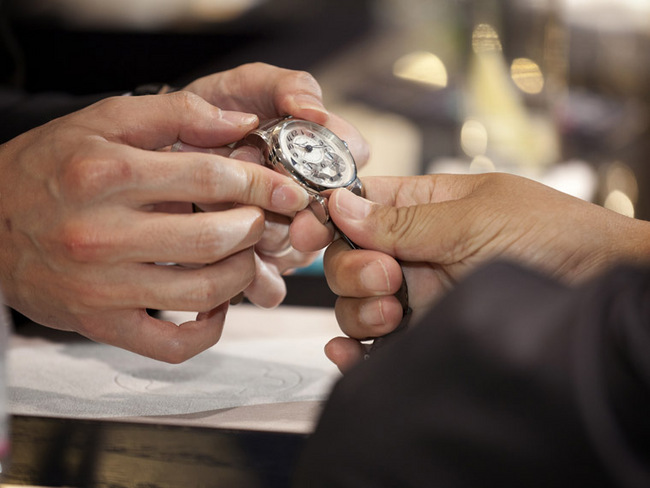 ▲貴賓用放大鏡觀看機芯,體驗製錶師製錶的流程。
