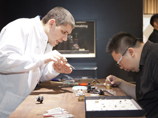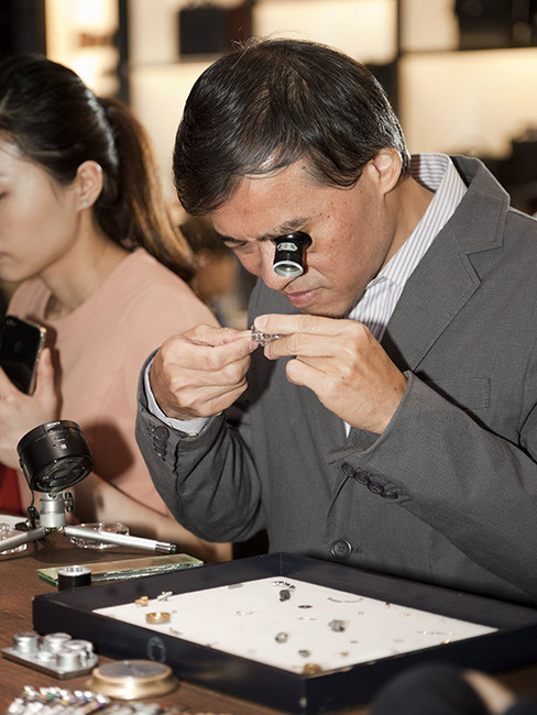 ▲鐘錶專家曾士昕先生也與製錶師一起互動,以放大鏡觀看機芯。