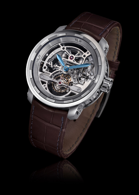 12時位置發條盒同樣採用鏤空裝飾,顯露內部構造。鏤雕造型借鑒一款古董汽車的方向盤設計,風韻古朴。發條盒的轉筒緩慢轉動,發條隨之展開,上軸在轉輪上滑動,展現又一DEWITT特有的重疊設計。828系列——鏤空陀飛輪手錶採用5級鈦金屬43毫米圓形錶殼,搭配藍色指針或經巧克力色PVD塗層處理的5級鈦金屬指針。錶殼厚度10.78毫米,稍薄於Academia系列。比例協調,配以精心改造的錶耳,錶側飾以更加內斂含蓄的帝王柱裝飾,DEWITT鮮明特徵一眼可辨。平衡的設計,獨到而精緻,與鏤空機芯的恢宏造型完美融合。在錶圈內側,18K玫瑰金鑲鑽內壁環抱機芯,凌駕於鏤空裝飾之上。由此而形成的光影效果美妙玄幻,展現出獨一無二的美感。四處精雕細刻的「W」字樣裝點內壁四個基點。