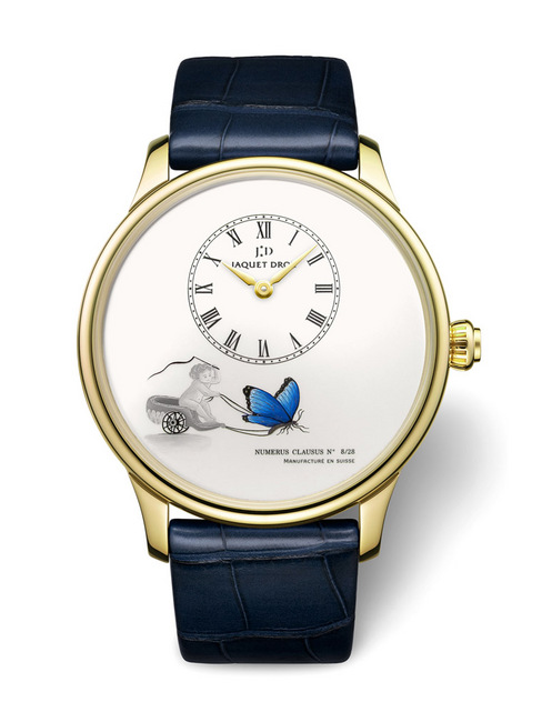 愛之蝴蝶手錶The Loving Butterfly不僅是穿越時空的旅行,還表達出品牌創始人富有遠見的價值理念:科學的精準,探索的精神,對自然的激情,而這些,都由色彩豐富明晰的大明火琺琅絲絲入扣地呈現出來。愛之蝴蝶手錶是品牌首枚黃金錶殼手錶,它致敬品牌誕生275週年的同時,也寓意愛之珍貴。錶背標注限量28枚的獨立編號,還可欣賞到白金擺陀優美運作及錶背的手工鐫刻字樣,其細膩與精美均歷歷在目。這兩處標誌性細節,由雅克德羅藝術工坊Ateliers d’Art打造,它不僅延續雅克德羅傳奇,還將每一秒的時間流逝都演變成夢境。