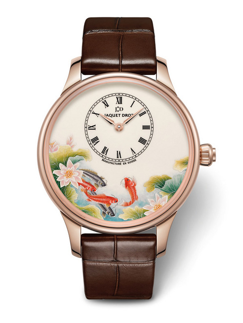 雅克德羅的製錶大師從夏日荷塘中暢游的錦鯉汲取靈感,以鮮艷唯美的色調和細膩筆觸活靈活現地繪製出一幅「忽聞錦鯉擊水聲,魚躍碧波清輝游」的精美畫作。面盤上錦鯉飽滿豐潤的色澤和濃墨淡彩的睡蓮惟妙惟肖,意境清幽,甚至是流水的處理亦極富層次感。中國自古有「鯉魚跳龍門」 之說,喻人飛黃騰達,官運亨通,因此人們常以錦鯉祝福他人,寄語“吉祥與幸福”。而「出淤泥而不染,濯青蓮而不妖」的荷花更是高雅亮節的象徵。今天,雅克德羅將這幅飽含美好寓意的畫作繪製與面盤上,更為尊貴的佩戴者帶去「好運相隨」的祝福。