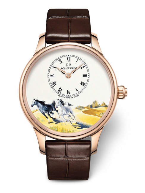 從蒙昧時代開始,駿馬就一直伴隨人類歷史的發展。馬不僅是活力與勇氣的象徵,更是今年雅克德羅JAQUET DROZ生肖手錶的主角。39毫米時分小針盤手錶的象牙色琺琅面盤上,雅克德羅的手工藝大師採用獨一無二的精湛工藝打造了兩匹純種阿拉伯駿馬,每一匹駿馬的肌理、馬鬃都刻畫的非常細緻,惟妙惟肖。其中凝聚了無與倫比的高超技藝,鐫刻、微繪和大明火琺琅。
