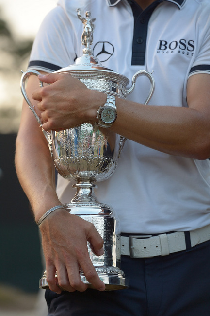 勞力士代言人馬汀.凱默爾(Martin Kaymer)於「美國公開賽」的頒獎禮上配戴完全採用稀有金屬之至尊——950鉑金打造的Cosmograph Daytona傳奇手錶,此錶款配有栗啡色CERACHROM 字圈和冰藍色錶面。