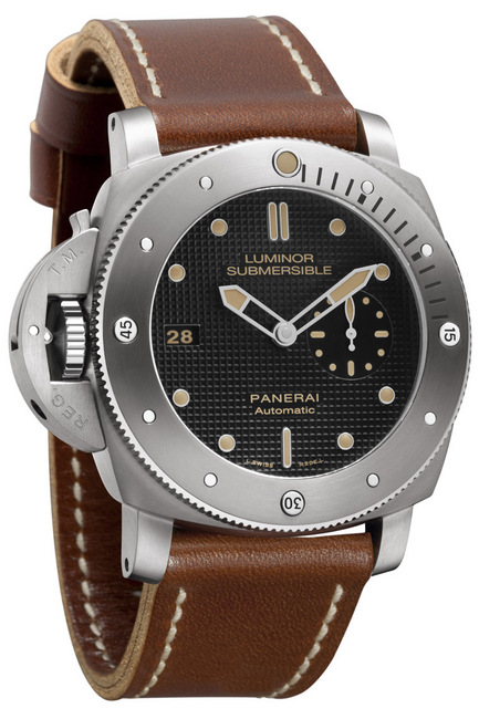 ▲ Luminor Submersible 1950左撇子手錶黑色面盤,飾有巴黎釘紋,另外配備飾以淺褐色縫線的棕色天然皮革錶帶。
