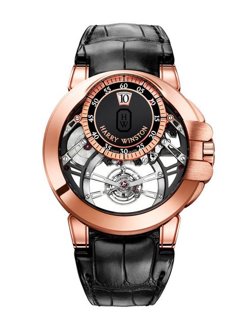 海瑞溫斯頓Ocean系列陀飛輪跳時功能手錶的陀飛輪設計非常特別。懸掛在兩個以手工倒角打磨的鋼制錶橋上,使陀飛輪裝置宛如懸空一般運行,跟其他置於機芯主機板的陀飛輪裝置有所不同。仔細觀察才能發現其中的奧妙:陀飛輪由連接外部框架的擺輪帶動運行,而擺輪則巧妙地隱藏於面盤的分鐘運行軌道後面。黑色藍寶石水晶面盤通過12點位置的數字盤,以每小時跳一次的方式顯示小時。與其他跳時手錶不同的是,海瑞溫斯頓Ocean 系列陀飛輪跳時功能手錶特別裝載分針指示,使跳時窗永遠不會被遮蓋。這款手錶將每60秒自轉一週陀飛輪和每小時運行一圈分針完美融合,展現了手錶本身的機械美感,而跳時功能則將自己的獨特節奏融入到高級鐘錶製作的交響樂曲中。