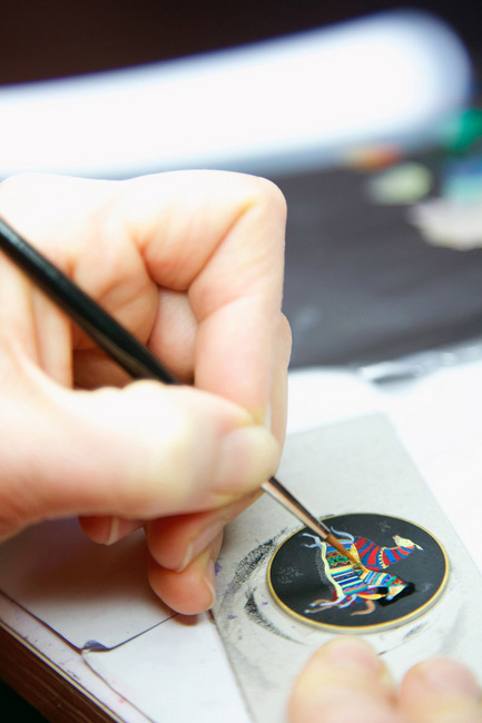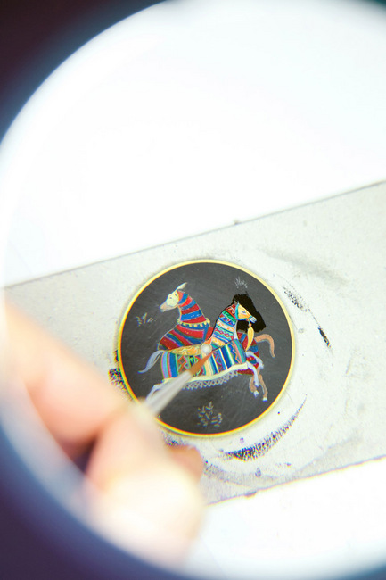 心靈手巧的漆繪工藝專家肩負微型藝術的挑戰,投放無比的耐性和專注度,為這些來自夢幻東方國土的馬術景色賦予生命。傳統法式漆繪工藝是在木材或青竹的平台上進行,現將它移植到金屬的基座上,必須結合無窮的創造力,並需重新審視這些傳統技術,推陳出新。