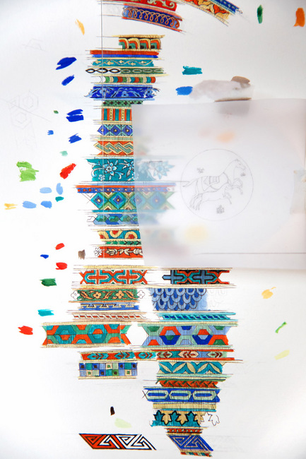 ▲ 工匠用一支極纖細的畫筆塗上底部的亮漆,將顏料與柯巴樹脂為底的清漆混合。