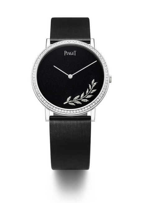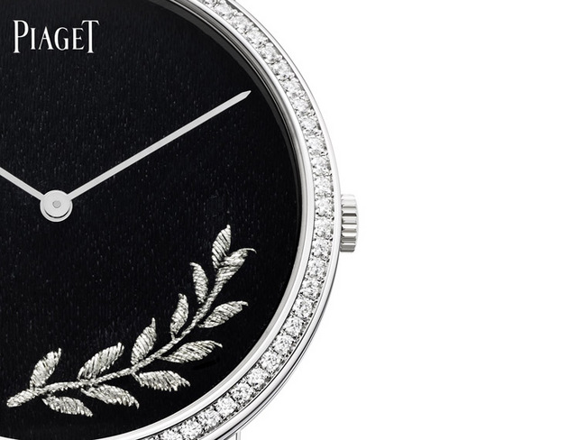 ▲ Altiplano手錶的月桂枝圖案採用直花莖針步(straight stem stitches),而月桂葉則以密繡針步(satin stitching)刺繡而成