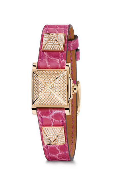 造型巧妙、又略顯淘氣的 Médor 手錶與時間建立有趣關係,時間時而隱藏 在金字塔形揭蓋之下,時而外露,不著痕跡。匠心獨具的時計作品備有多款色彩組合,兩種尺寸選擇,提供綴玫瑰金或精鋼金字塔形飾釘型號。Médor 手錶可選擇稜線鑲鑽或全鑲鑽,讓小心翼翼藏匿的時間更顯珍貴。