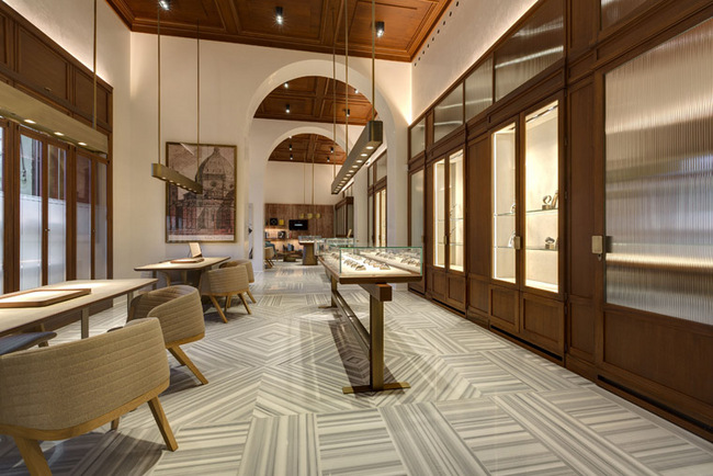 ▲ 佛羅倫斯專門店擁有多項經典及獨特元素。選用沛納海專門店常用的胡桃木,雕琢成方格天花板、手錶陳列櫃以至桌子,營造統一風格。