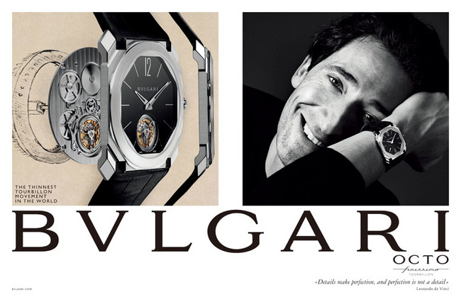 Brody身上的氣息很罕見:才華橫溢,棱角分明的丰采,加上極富魅力的性情。凡此,即詮釋了Octo Finissimo的精髓。這款手錶配置了超薄Finissimo自製手動上鏈機芯,結構優雅,性格鮮明,簡而言之:經典之作。Octo結合兩種精粹:來自義大利的天才,來自瑞士的精準,於是造就了一款令人目眩神迷的精密手錶傑作。