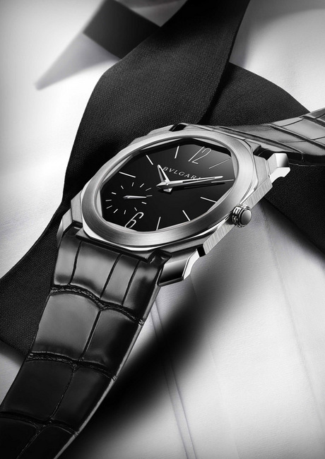 ▲ BVLGARI Octo Finissimo手錶古典優雅,直徑40毫米,厚度僅5毫米的鉑金錶殼內搭載著BVLGARI錶廠自製超薄手動上鏈Finissimo機芯 ,透出凜然純粹的簡潔氣質,又以拋光黑漆面盤的完美襯托,除了小時與分針之外,另於七點八點之間設有一個偏心小秒針。