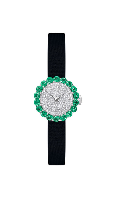 ▲ DIOR LA D DE DIOR 「PRÉCIEUSE」,21mm石英機芯, 750/1000鈀125白金鑲有祖母綠及鑽石。
