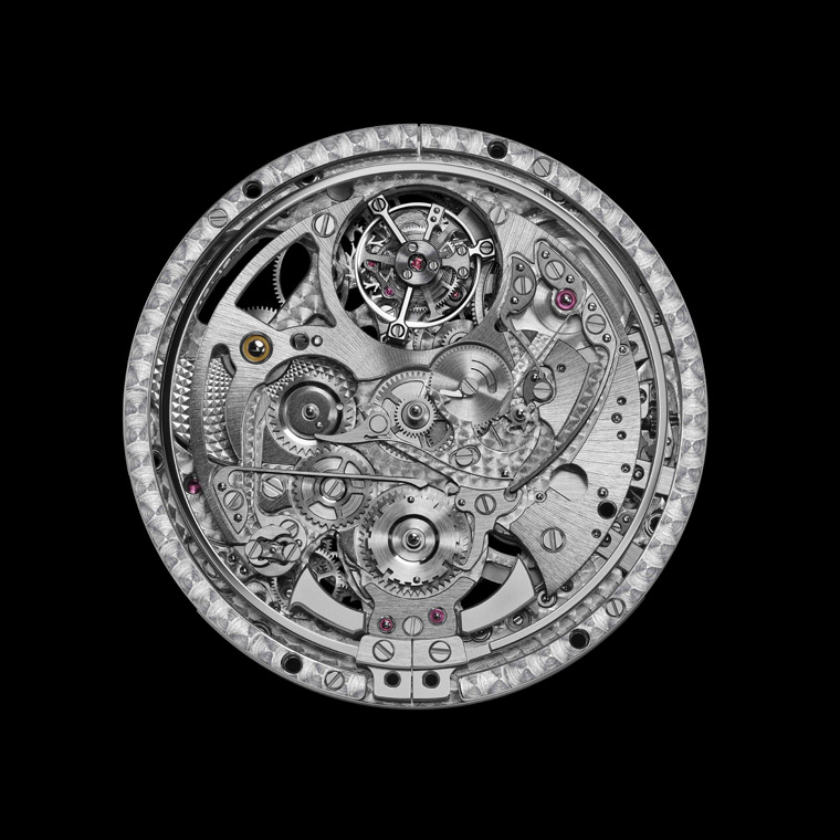 ▲ 鏤空的9406 MC型機芯使三問報時、萬年曆與浮動式陀飛輪盡現眼前,機芯的複雜結構與獨特美態一覽無遺。