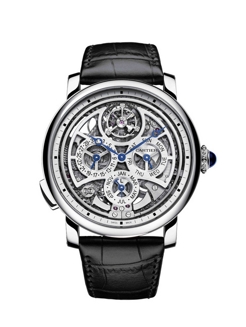 Rotonde de Cartier大型複雜功能手錶是精湛工藝的薈萃,配備18K黃金鏤空面盤與鏤空機芯,通透空間,美感盡現。不少構成三大複雜功能的零件亦採用鏤空裝飾,在美學層面上彰顯「Poinçon de Genève」(日內瓦優質印記)的精湛水準。倒角、側面拉絲、寶石鑲嵌、凹槽拋光等修飾在此枚機芯上盡現眼前,顯得更為重要。鏤空面盤讓三大複雜功能的排列更見和諧:萬年曆顯示盤清楚展示日期、星期、月份與年份;浮動式陀飛輪與三問報時的音簧、音錘亦裝點面盤空間。