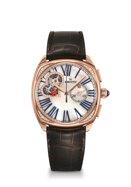 擁有柔中帶剛的枕型外觀,錶圈鑲嵌28顆頂級美鑽襯托珍珠貝母錶面的圓潤無暇,經典的開芯視窗更由35顆美鑽包覆,更加突顯心型設計。透過開芯視窗可一窺El Primero 傳奇機芯36,000轉的高振頻跳動,超高速的轉動彷彿戀愛時的心跳加速;亦可同時觀看視窗下緣自轉的紅色心型小秒針,完美象徵心心相映的戀人密語。錶冠鑲嵌藍寶石、搭配羅馬數字時標與中央時分顯示,亦展現古典的浪漫情懷。