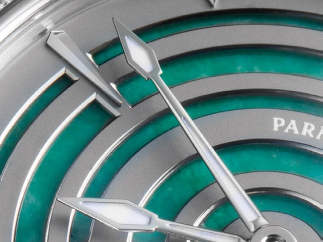 以迷宮為發想設計成面盤,帕瑪強尼特別選用稀有的緬甸翡翠作為面盤底層,並將白金鏤空盤面置於上方,使其碧綠的迷人色澤能透現於盤上,獨特且神祕,也帶有東方氣息。輕薄的圓形翡翠片於加工時極為困難,可想見工匠於其上打造出孔洞時的難度與所需技術。