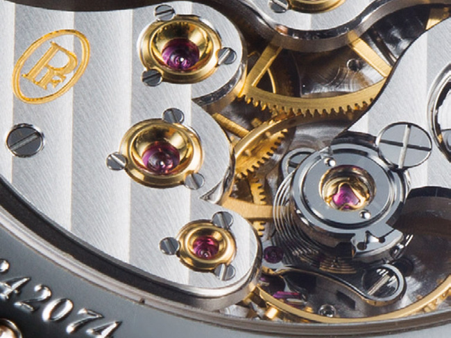 內搭的PF357手動上鍊機芯透過底蓋可欣賞到其精細的打磨細節,其更特別裝配調速輪,可確保發條能持續供應能量及令三問報時裝置無任何雜音地運行。