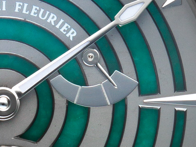 精緻的面盤以小三針為顯示機制,加以位於中軸右方的動力儲存顯示標示出手錶餘下動力 狀況,除此以外,手錶還備有三問報時裝置,其特別施以多種配備來提升三問報時質素:首 先,由於增加了一個額外的固定點,使機芯與錶殼的集成更加穩固,而報時器下方有一個小 部件將報時器棘爪連接到錶殼上,從而使報時器更為穩固,同時迴蕩的聲音也不受振動影響;第二,機芯上裝配了調速輪,其能確保發條持續供應能量,而且能確保機械寂靜無聲,使優美的報時樂音能在毫無雜音環境下成為主角;此外,錶殼的尺寸也是另一要因,46mm 的闊大鉑金錶殼能令聲波振盪頻率恰到好處,提供完美音響效果,讓三問音階旋律更純粹而美麗。