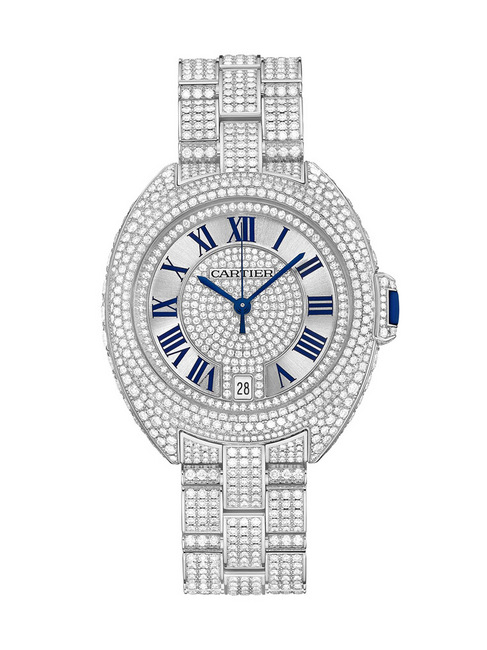▲ 卡地亞Clé de Cartier系列鑽錶,直徑35毫米,18K白金錶殼,搭載卡地亞1847 MC型工作坊精製自動上鏈機械機芯,錶殼、面盤與鏈帶鋪鑲鑽石。建議售價 NTD,200,000元