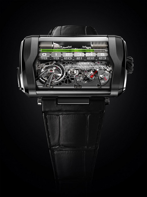 正如從一開始便解釋過,H3成為了HYT系列中最與別不同的手錶。其雙發條鼓為手錶提供170小時的動力儲備(相當於約7天)。PVD碳灰色塗層的鈦金屬配鉑金材質錶殼,限量製造25枚。首枚手錶將於2015年9月上市。
