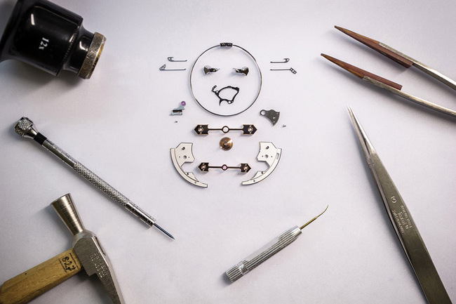 看似簡單事物,實際卻有極為複雜的高要求。專業製錶大師至少需要花費270小時才能組裝、調節好這一非凡裝置。三問裝置的生產工序極為繁複,同時將音錘置於同一平面處,充當支架,在擊打前上緊發條,使之有必要在機芯外運用模擬未來位置的特殊工具調節音錘,從而讓這一工作變得更加耗時耗力。儘管如此,最後的成果有目共睹,運用黑色拋光精鋼製作的這些細小組件經過斜削處理,凸顯出以三金橋為靈感的原創設計,慣性高,每次擊打都能發出清晰、悅耳的音符。
