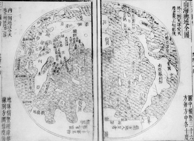 就如當時頌揚探索新土地的風氣,這個陸面地圖上已出現了五大洲。即使將利比亞做為非洲的代錶,以澳大利亞來代錶澳洲,但是也完整標示了四大洋。其他精緻之處,透過中文標示,展現出極為驚人的地理與天文精密度:尼羅河是全世界最長的河流、地球是圓的、日夜時間的差異都次此出現說明,地球與一些其他星球的距離,也透過錶格來解釋。