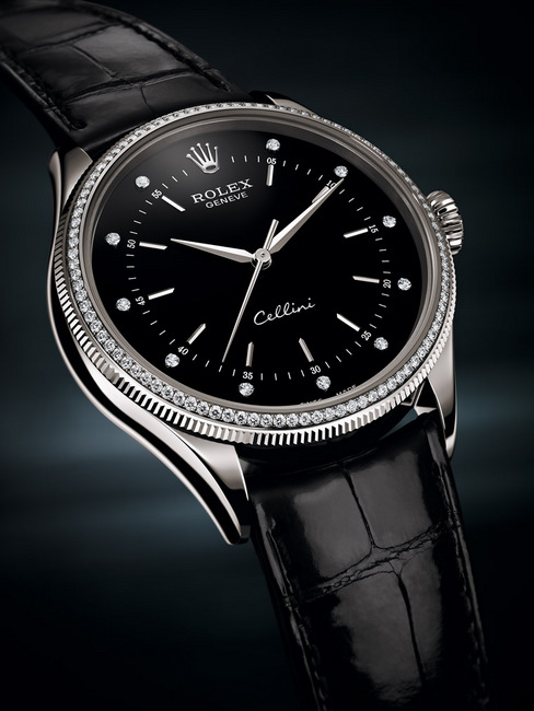 鑲嵌寶石的Cellini Time配有39毫米18 ct白色黃金或永恒玫瑰金錶殼,並配備鑲鑽單外圈或雙外圈以供選擇。鑲嵌96顆鑽石的雙外圈與勞力士的經典三角坑紋外圈相映成趣。在黑色漆面錶面上,11顆鑽石分別鑲嵌在鐘點標記的一端,奪目耀眼。鑲嵌62顆鑽石的單外圈款式則配搭粉紅色或銠白色錶面,太陽光線效果,襯托加長鐘點標記。此外,Cellini Time配備半啞黑色縫線鱷魚皮錶帶,搭配與錶殼金屬相襯的18 ct金帶扣。