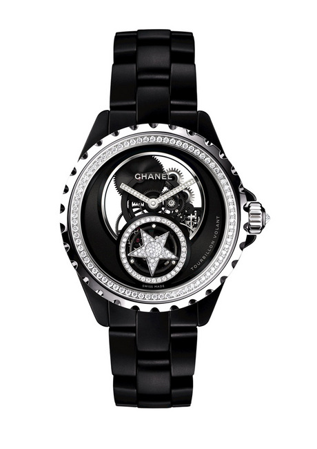 J12 高級手錶陀飛輪以彗星造型設計,星星彷佛在無重力狀態下輕盈轉動,展現著高複雜功能,無上錶橋的陀飛輪為CHANEL與瑞士製錶大師Renaud & Papi(隸屬 APRP SA)緊密合作的成果。精緻面盤微露出卓越製錶的鏤空機芯,展示獨特美感,以霧面、拋光、光面呈現不同的黑色及鋪鑲千顆耀眼美鑽。