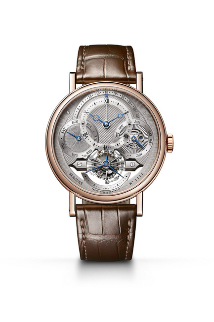 6時位的一分鐘陀飛輪與時圈相互輝映。這複雜功能製作特別困難,因為它是安裝於一個小圓頂之上,曲線及錶橋經仔細倒角並攻克了顯示秒鐘的三重秒針。9時位的星期副面盤鐫刻以波浪圖案。機芯內置一蝸形凸輪令星期指針可瞬間跳躍。3時位月份副面盤飾以閃閃發光的太陽紋圖案,配以一根藍鋼指針。中央飾有藍色太陽以顯示閏年。