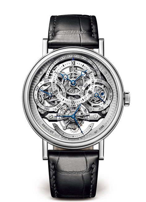 Classique Tourbillon Quantième Perpétuel 3795 萬年曆鏤空陀飛輪手錶搭配皮錶帶配雙折叠錶扣。另備18K玫瑰金錶殼,Ref. 3795BR/1E/9WU。搭載自動上鏈機芯,備有編號及寶璣簽名。586機芯,6¾法分,29顆寶石軸承。38小時動力儲備。直線式瑞士槓杆擒縱機構。矽質擺輪游絲。3赫茲振頻。