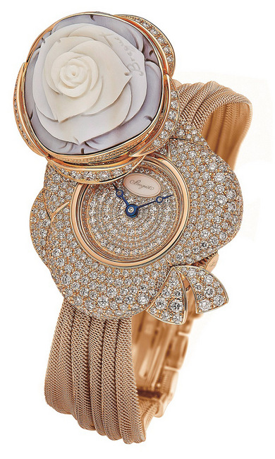 全新Secret de la Reine系列保留前身的特徵,但賦以更華麗的金屬錶帶,仿模一圈圈的褶襉絲帶。一般而言秘密手錶即將時間隱蔽起來,推開貝殼浮雕玫瑰即可顯示時間。這個雕刻精美的浮雕描繪了玫瑰的第一組花瓣,鑲嵌於手錶上的鑽石及系列象徵的花結,為浮雕玫瑰增添美態。備有玫瑰金或白金版本,這款手錶共沒有背棄寶璣許下於女士手錶裝配機械機芯的承諾。因此,這款時計配備了自動上鏈 586機芯,可透過塗上兩層防昡光塗層的底蓋玻璃展示機芯運作。